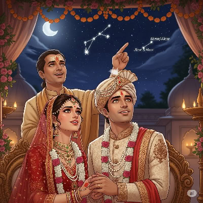 హిందూ వివాహాలలో వైవాహిక ఆనందానికి ప్రతీకగా ఏ స్త్రీని నక్షత్ర రూపంలో ఆవాహన చేస్తారు?