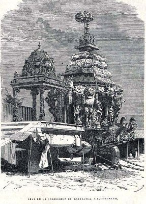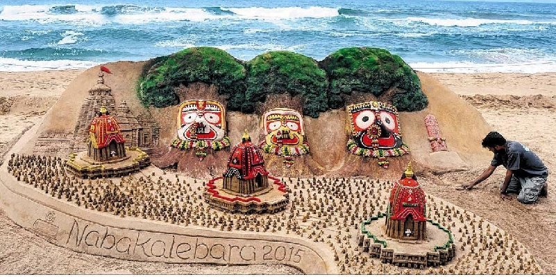 ಭಗವಾನ್ ವಾಸುದೇವನ ಸೂಚನೆಯ ಮೇರೆಗೆ ಇಂದ್ರದ್ಯುಮ್ನನು ಪುರಿಯ ಸಾಗರದಲ್ಲಿ ಧರು (ಮರದ ದಿಮ್ಮಿ) ಯನ್ನು ಕಂಡನು. ಈ ಧರುವಿನಿಂದ ದೇವತೆಗಳನ್ನು ಕೆತ್ತಬೇಕಾಗಿತ್ತು ಆದರೆ ಯಾವುದೇ ಬಡಗಿ ಅದನ್ನು ಮಾಡಲು ಸಾಧ್ಯವಾಗಲಿಲ್ಲ. ವಿಶ್ವಕರ್ಮನು 21 ದಿನಗಳ ಕಾಲ ಯಾವುದೇ ತೊಂದರೆಯಿಲ್ಲದೆ ಬಿಟ್ಟರೆ ದೇವತೆಗಳನ್ನು ಕೆತ್ತಲು ಮುಂದಾದನು. 15 ನೇ ದಿನ, ಕೆತ್ತನೆ ನಡೆಯುತ್ತಿರುವ ಕೋಣೆಯಿಂದ ಯಾವುದೇ ಶಬ್ದ ಬರದ ಕಾರಣ ರಾಣಿ ಗುಂಡೀಚಳು ಅಶಾಂತಳಾದಳು. ಅವಳ ಒತ್ತಾಯದ ಮೇರೆಗೆ, ಇಂದ್ರದ್ಯುಮ್ನ ಕೋಣೆಯನ್ನು ಒಡೆದಳು. ವಾಗ್ದಾನ ಮುರಿದಂತೆ, ವಿಶ್ವಕರ್ಮನು ಸಂಪೂರ್ಣವಾಗಿ ರೂಪುಗೊಳ್ಳದ ದೇವತೆಗಳನ್ನು ಬಿಟ್ಟು ಕಣ್ಮರೆಯಾದನು. ಅವರಿಗೆ ಕಾಲುಗಳಿಲ್ಲ, ಕಿವಿಗಳಿಲ್ಲ ಮತ್ತು ತೋಳುಗಳು ಕೇವಲ ಮೊಂಡಾಗಿದ್ದವು.